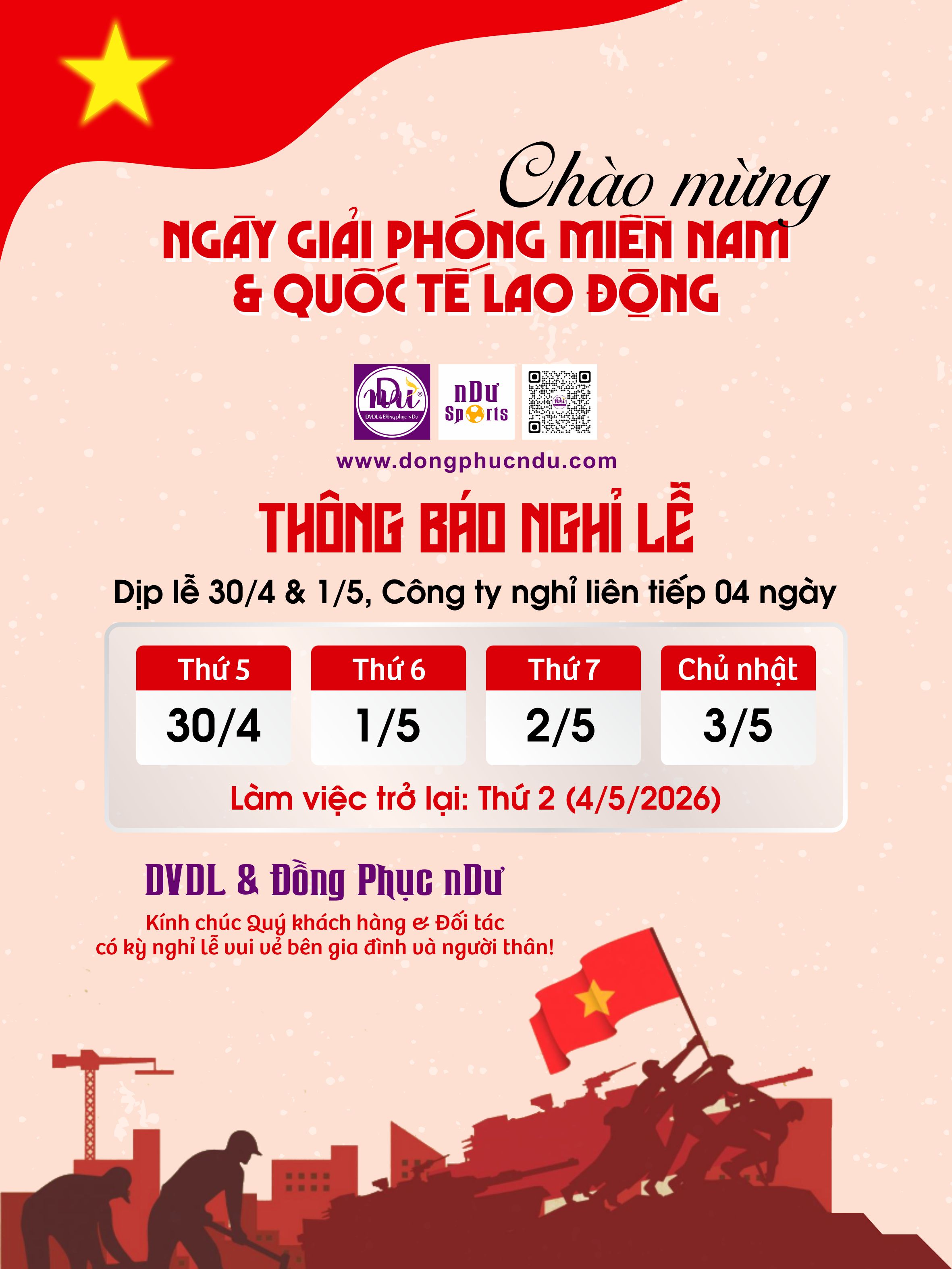 Nhân Kỷ niệm 51 năm ngày Giải phóng Miền Nam Thống Nhất Đất Nước 30/4 & ngày Quốc Tế Lao Động 1/5, DVDL và Đồng Phục nDư xin gửi đến Quý khách hàng và đối tác lịch nghỉ nghỉ lễ của Công ty như sau: